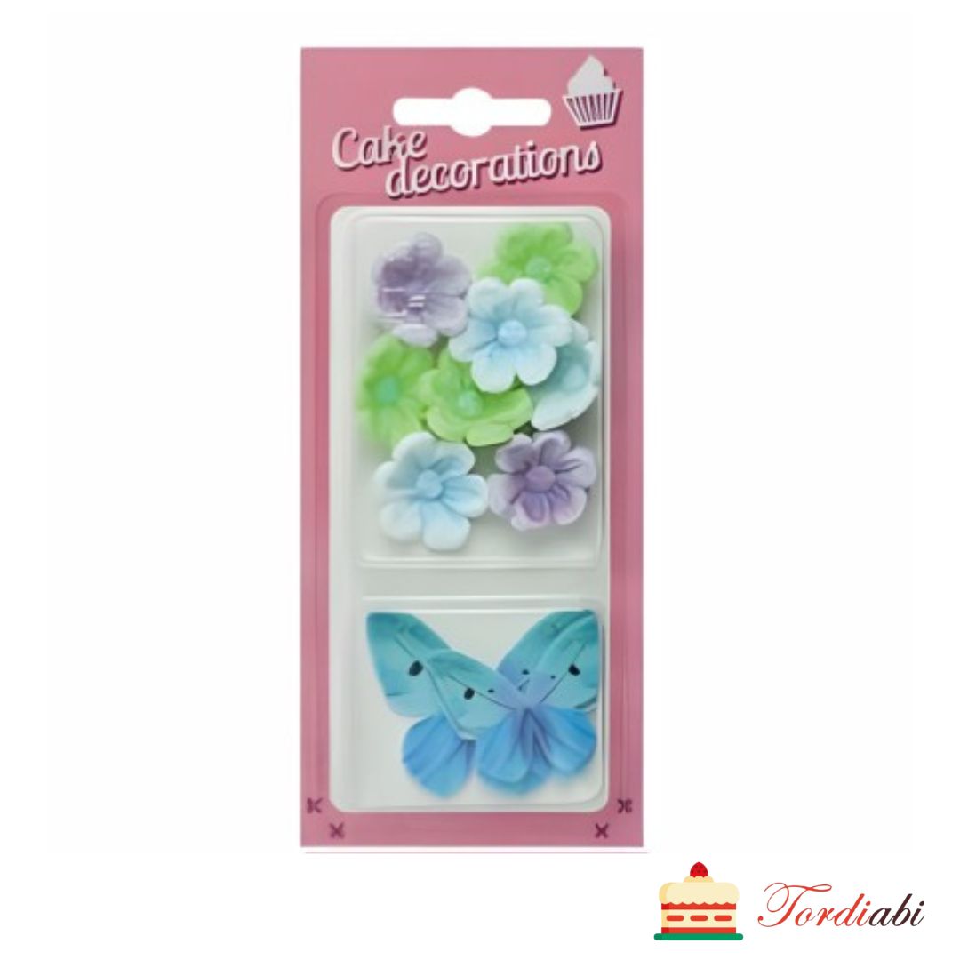 Kaunistuskomplekt, suhkrudekoorid – helesinised/ rohelised lilleõied ja sinised vahvliliblikad