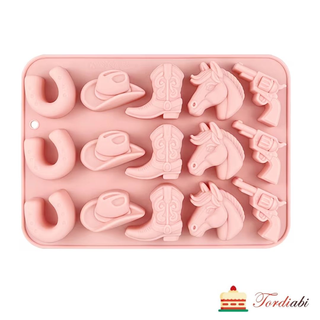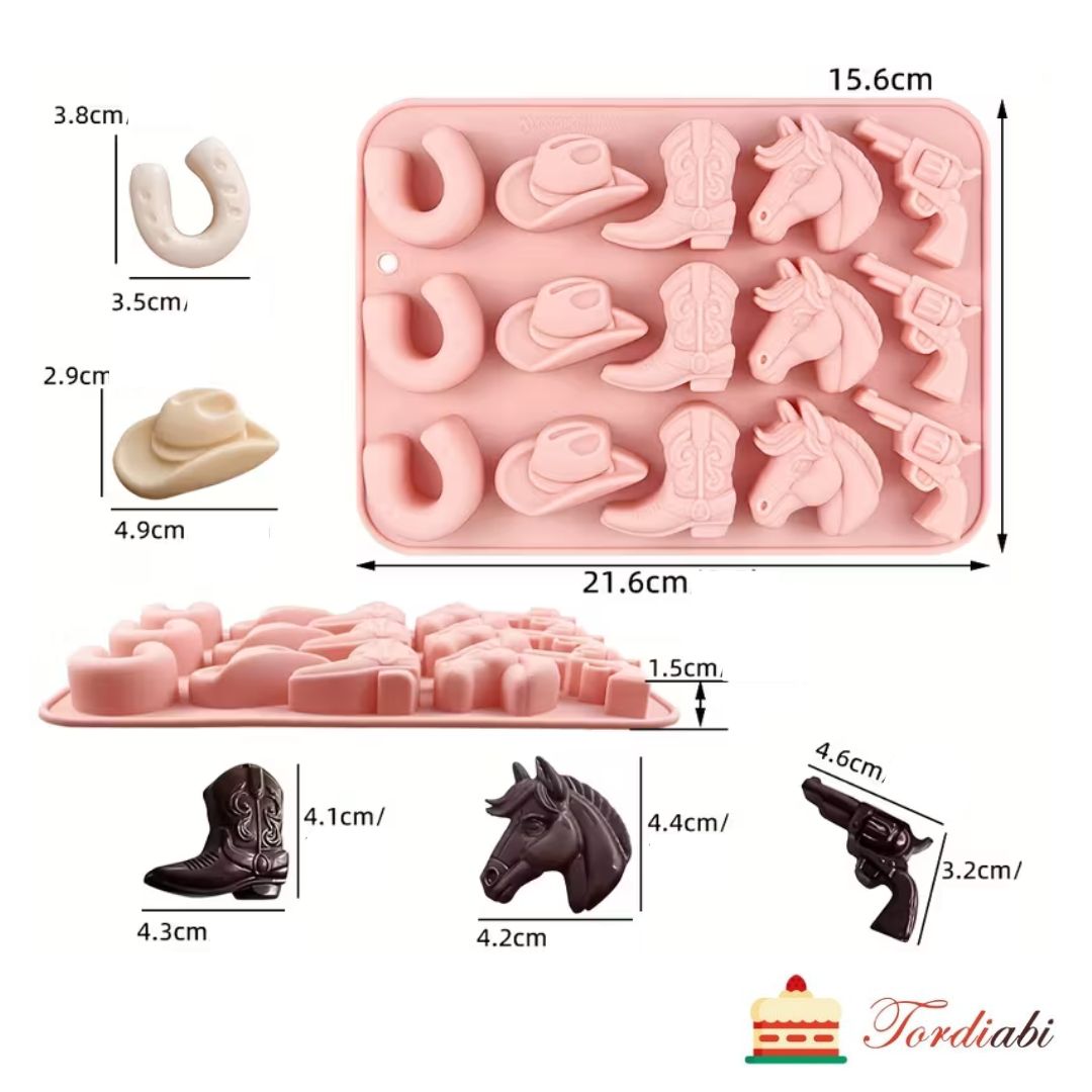 Suurepärane vorm kauboi aksessuaaride valmistamiseks: kaabu, püstol, hobune, hobuseraud, kauboisaabas. Sobib kasutamiseks nii šokolaadi kui ka suhkrumassiga.