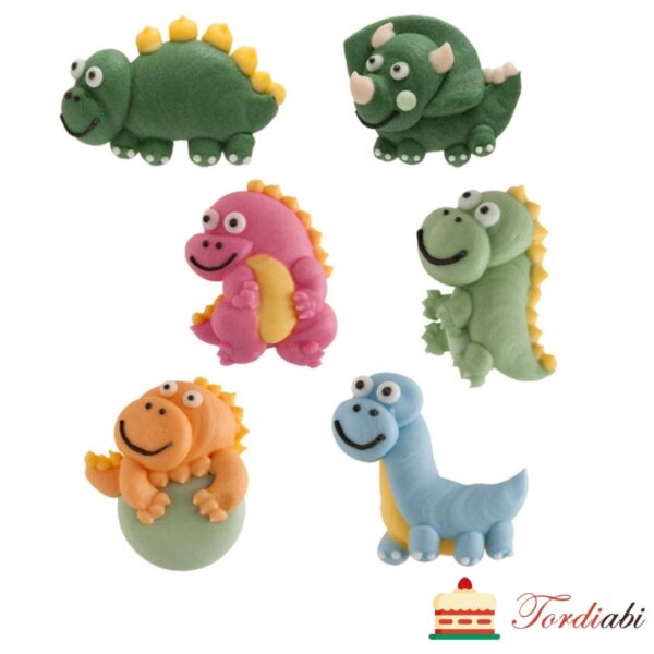 Pilkupüüdev kuuest dinosaurusest koosnev 2D assortii temaatilise sünnipäevatordi peale: erinevad värvid- roheline, helesinine, oranž.