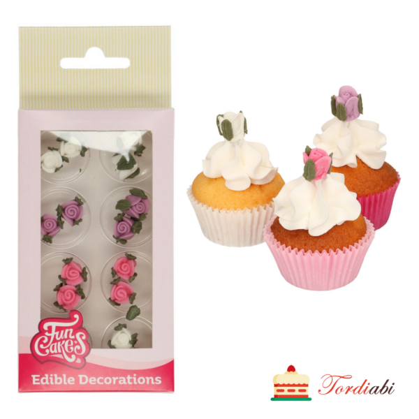 FunCakes suhkrudekoor, pisikesed roosiõied lehtedega 1 x 1,5 cm/ roosad (4), lillad (4) ja valged (8)