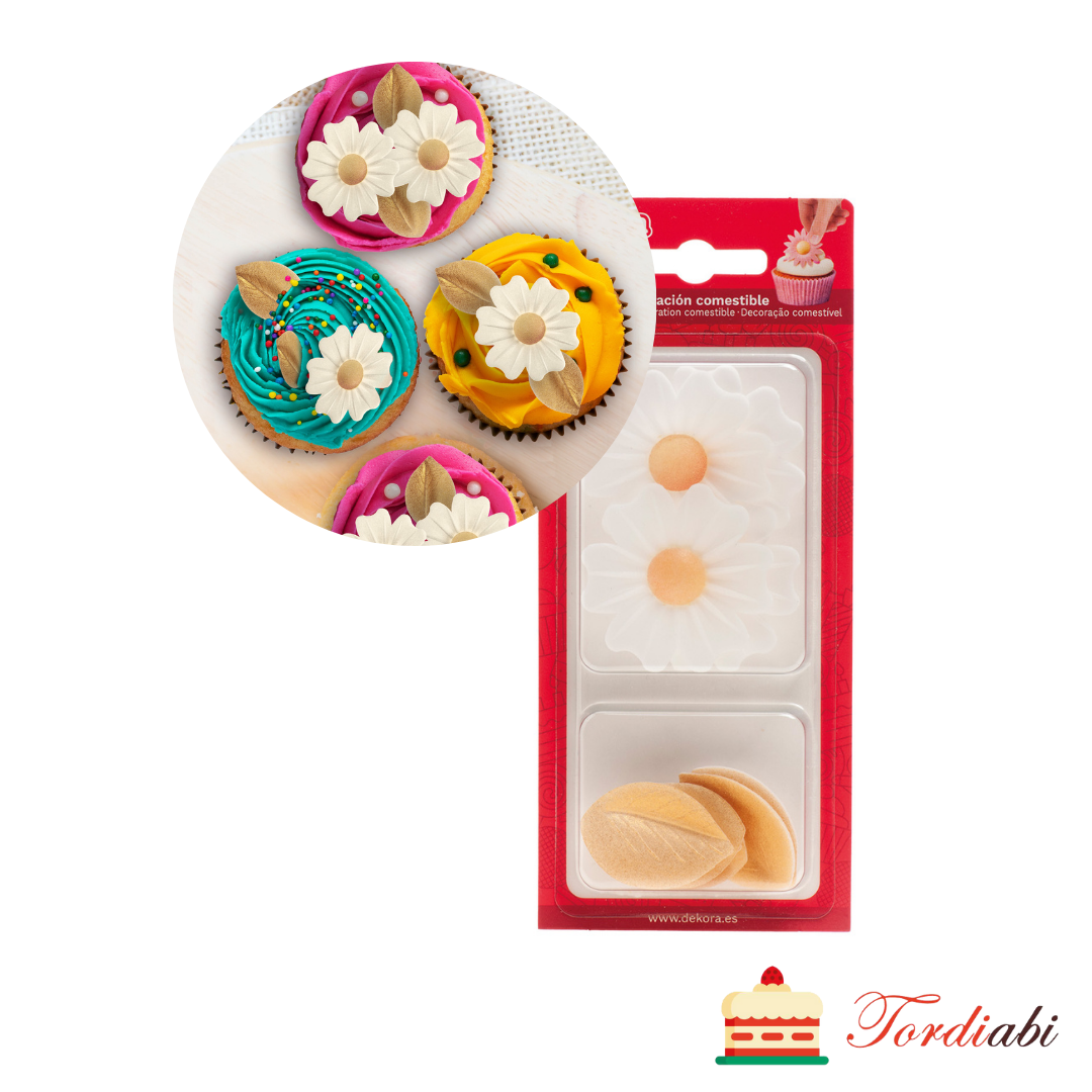 Komplekt, vahvlidekoorid – valged lilleõied kollase südamikuga (4 tk) + kuldsed lehed (6 tk)