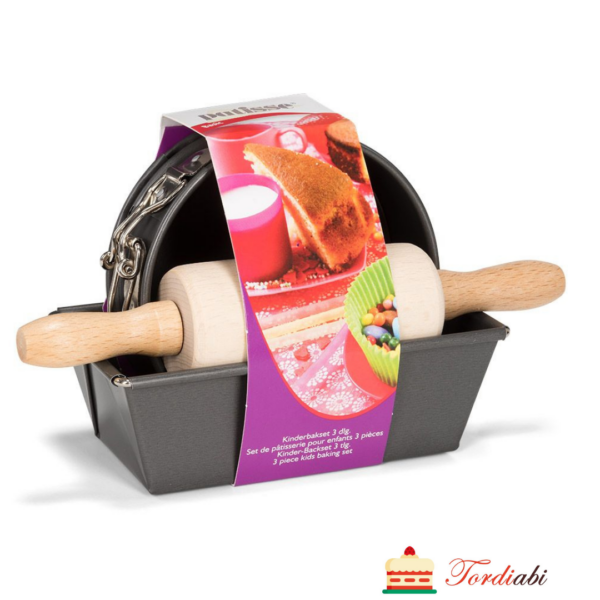 Suurepärane kingiidee  väikesele küpsetajale. Komplekt koosneb taignarullist, ümmargusest alt lahtikäiva põhjaosaga küpsetusvormist ja kandilisest keeksivormist.