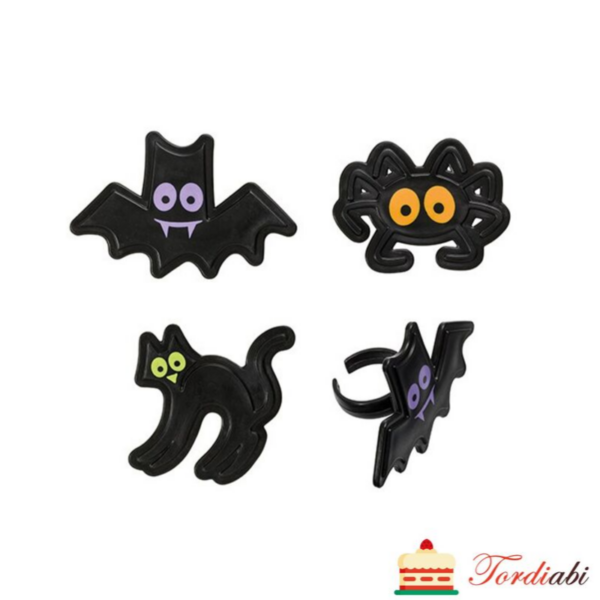 Mittesöödavad tordikaunistused (sõrmused), Halloweeni teemalised, 3 erinevat motiivi – nahkhiir, ämblik, kass – kaunistamiseks muffinitele ja tassikookidele.