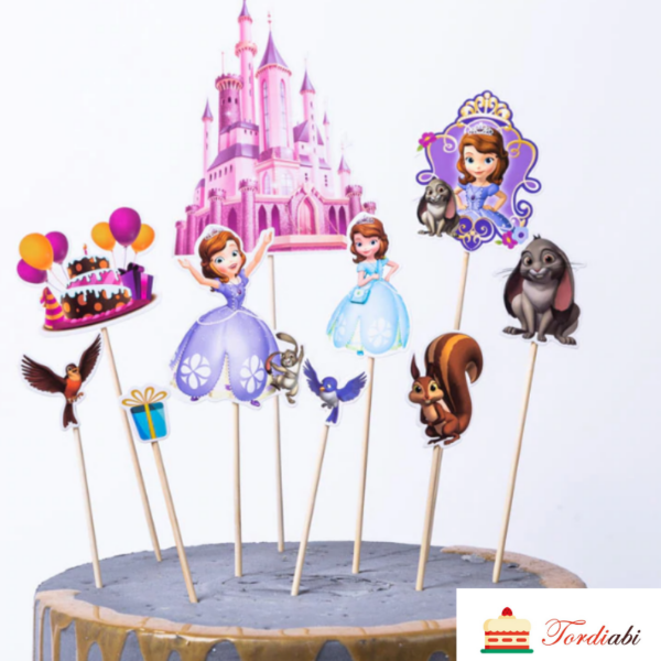 Pilkupüüdev 10-st topperist koosnev komplekt: 3 x printsess, orav, jänes, kingipakk, 2 x lind, loss, õhupallidega tort.