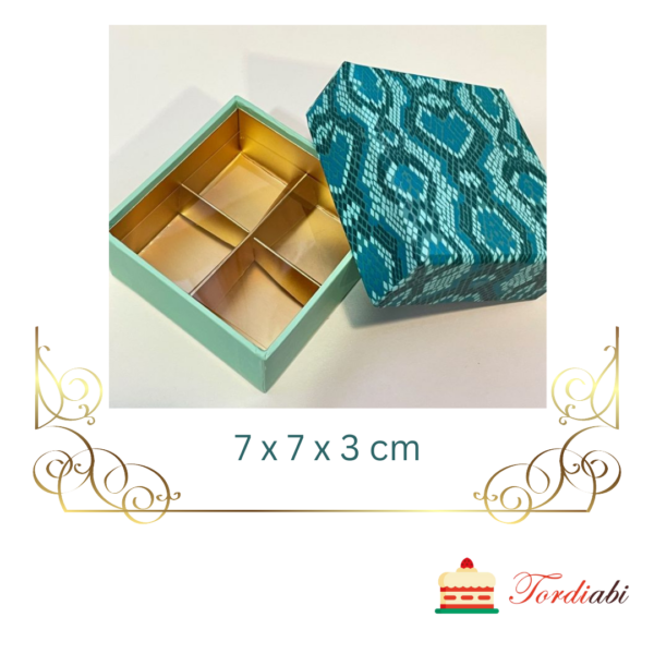 Esileht / Kõik torditegemiseks vajalik VÄRVIDE KAUPA / Sinine / Türkiissinise mustriga kommikarp 4-le kommile, läikiv sisu – 7 x 7 x 3 cm