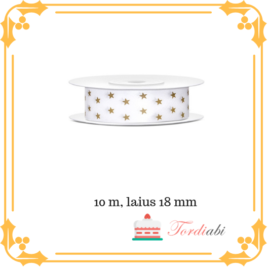 Esileht / Kõik torditegemiseks vajalik TEEMADE KAUPA / Eesti Vabariigi sünnipäevaks / Valge satiinist pael kuldsete tähekestega, laius 18 mm – 10 m