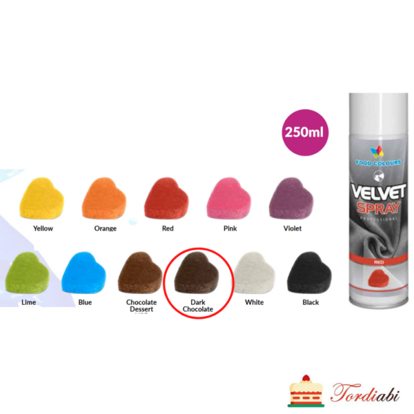 Tortide ja kookide tumepruuni värvi sametise šokolaadiga katmiseks, sprei pudelis. Värvitav pind (šokolaad, suhkrumass, martsipan, pralinee, koogikreem) peab olema jahutatud!
